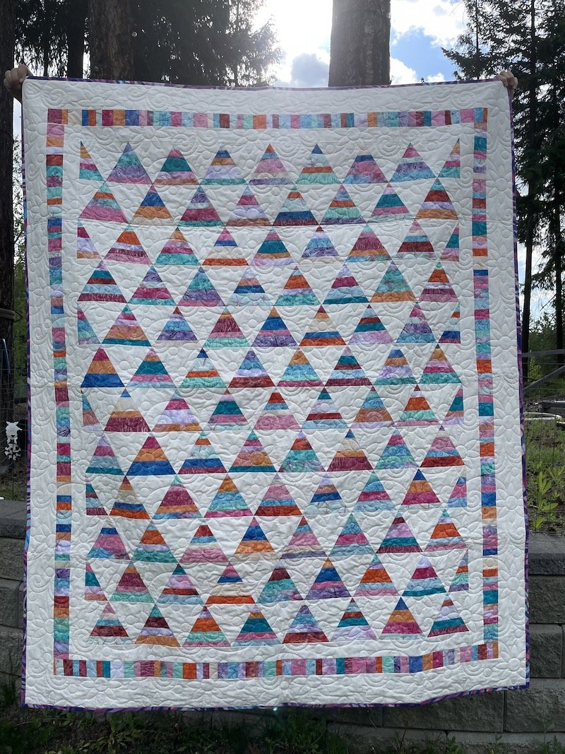 What a fun and colourful quilt! You can use scraps or coordinated bundles, or even random fat quarters for a fun scrappy look. Learn a new technique making strata and sewing triangles together to create this fun quilt.